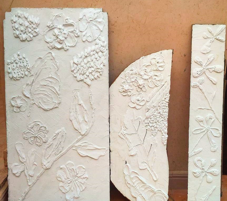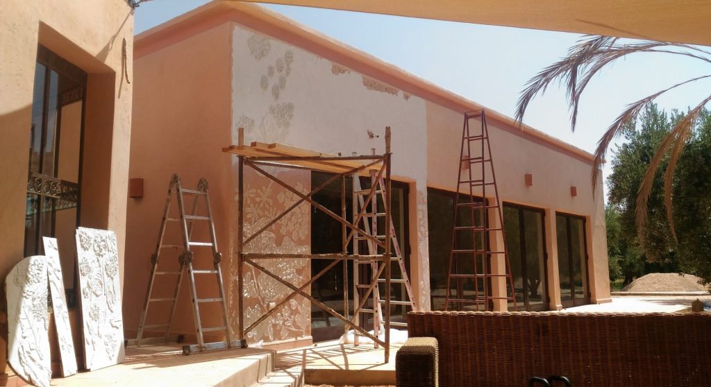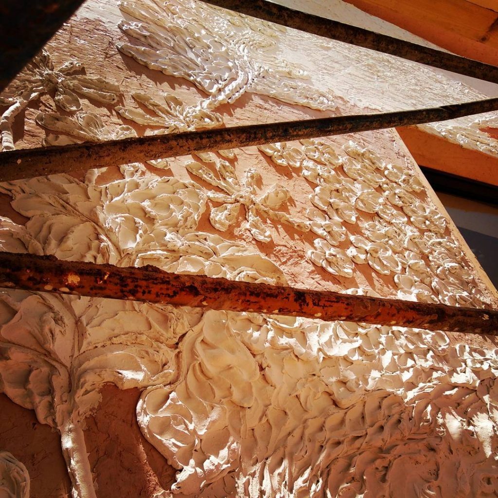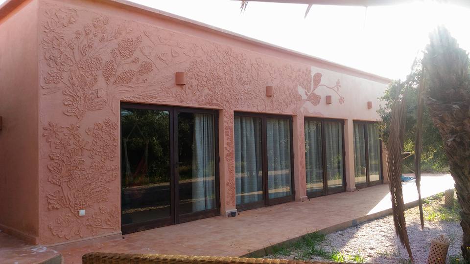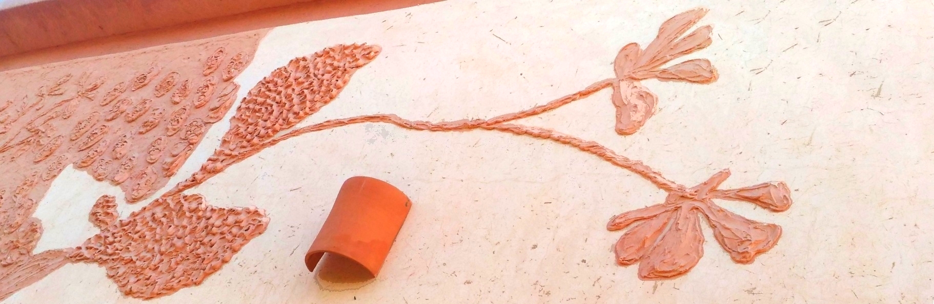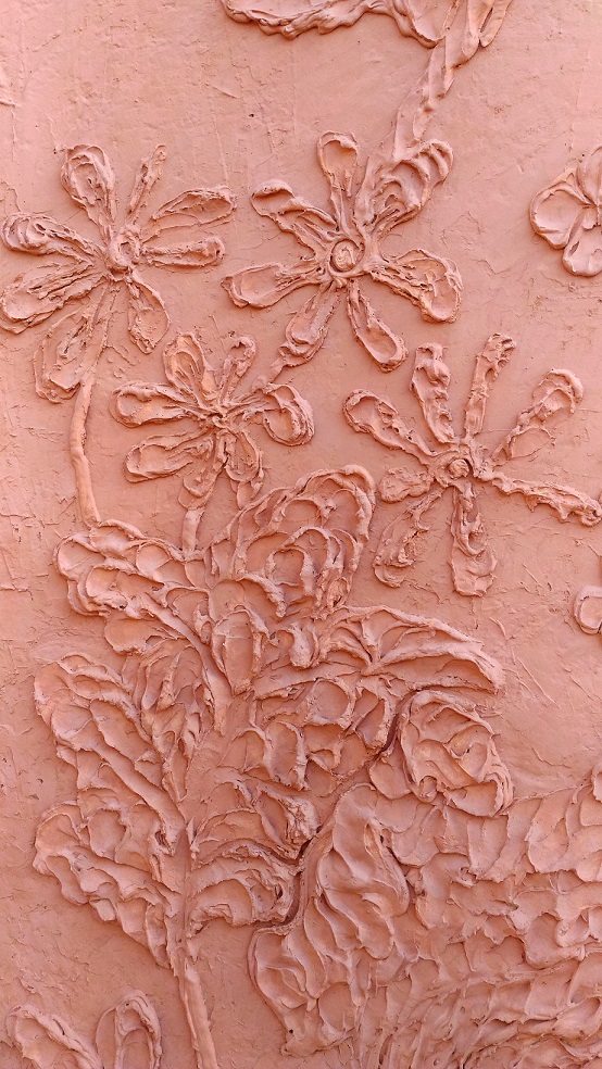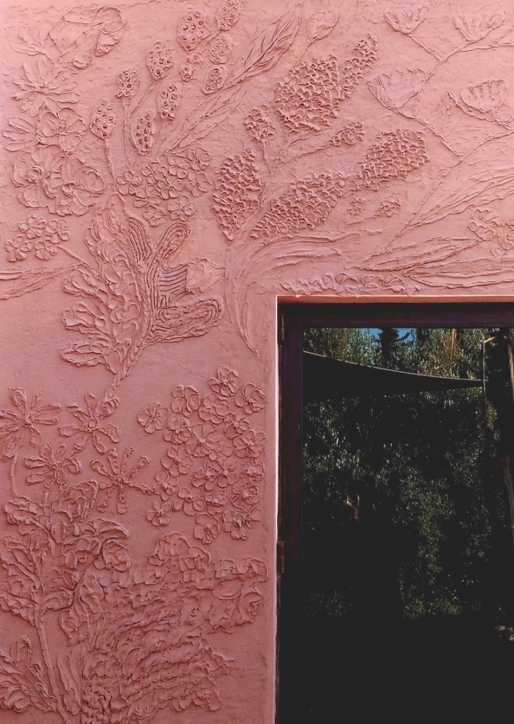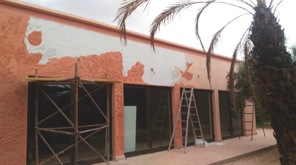 Stucco relief project created on the facade of the Yoga Retreat building during the artistic residency in Dar Slimane – Morocco.Research on the native flora in Dar Slimane and development of drawing and stucco sketches on wood.